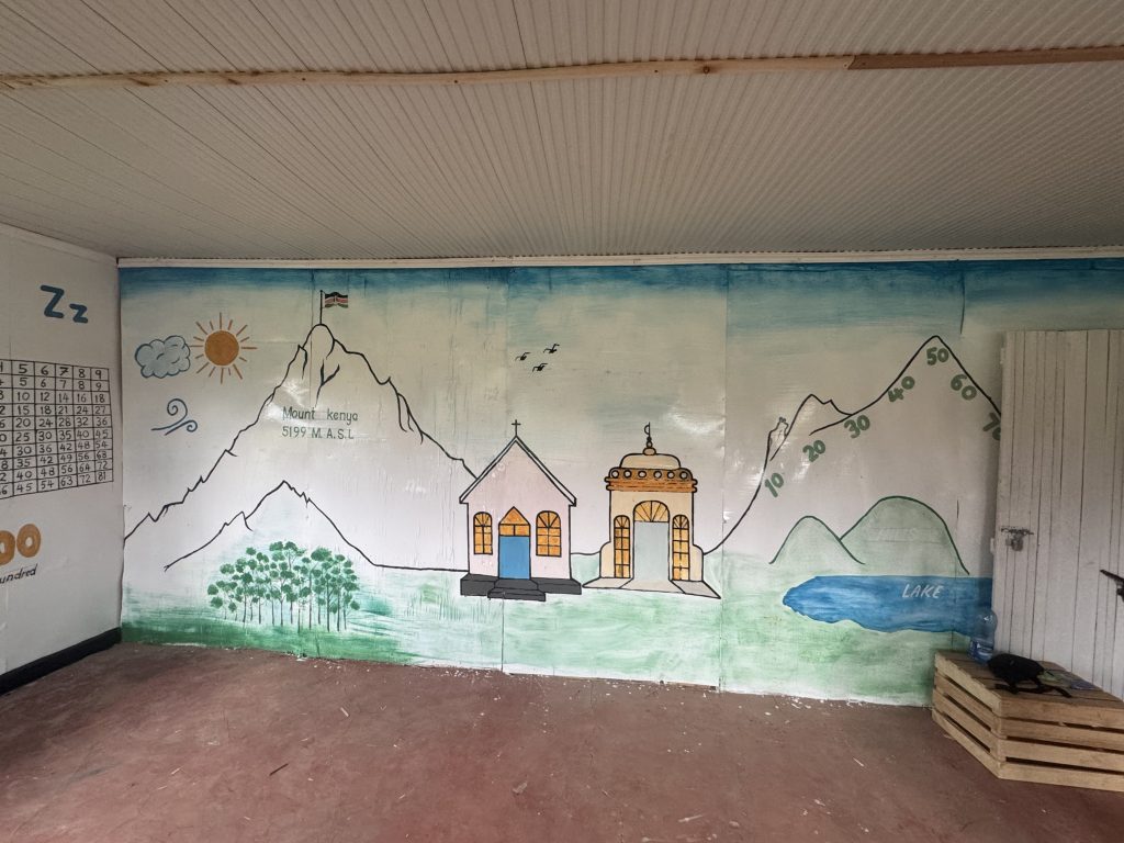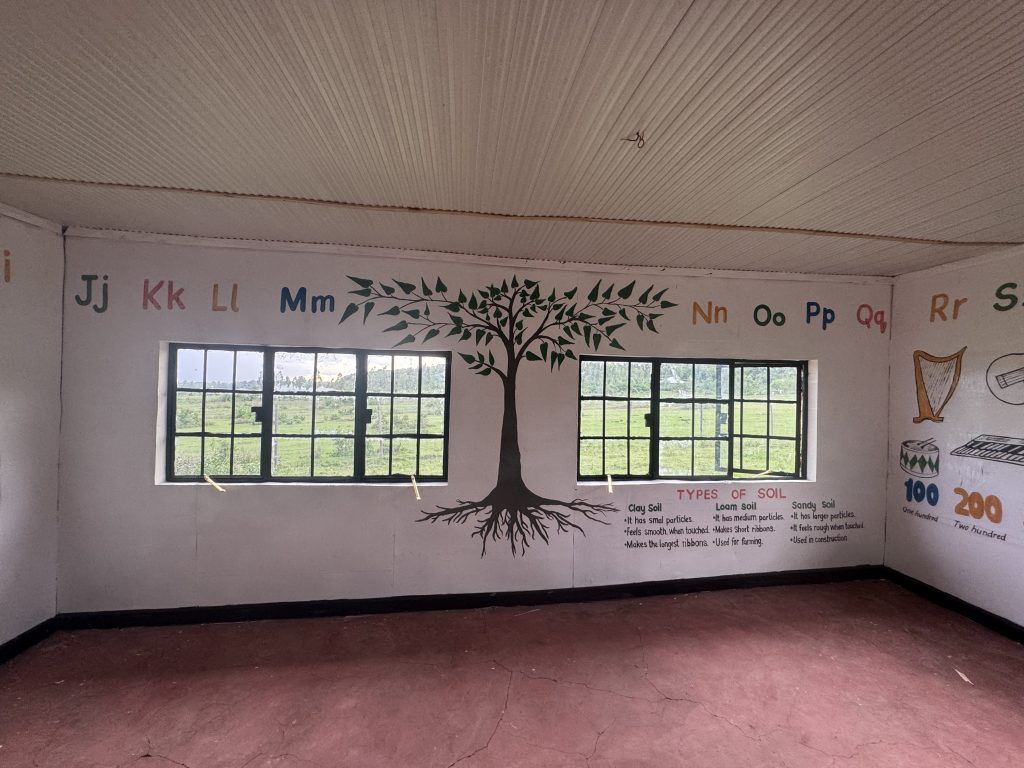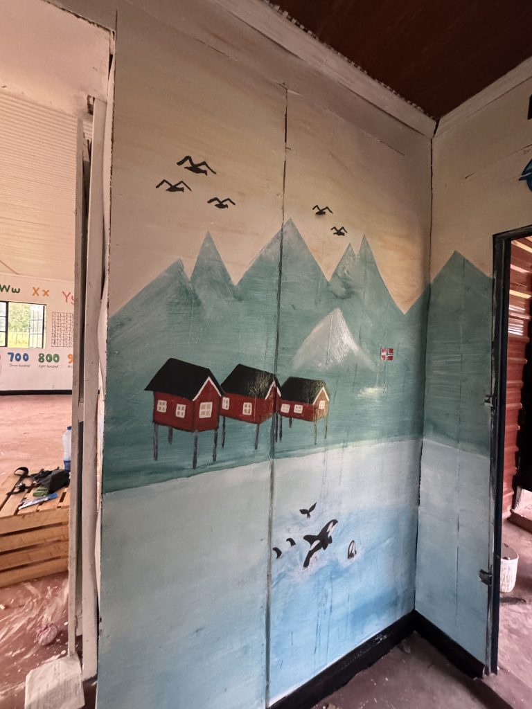 I løpet av de siste dagene, har klasserommet til tredjeklassen har blitt vårt lille hjerteprosjekt. Her fikk vi idéen om å male noe som kombinerer pensum med et mer kunstnerisk uttrykk. I de andre klasserommene er motivene malt som separate objekter, mens hos tredjeklassen ville vi skape et mer helhetlig bilde; noe som både inspirerer og underviser. Vi har delt visjonen vår med læreren, som liker idéen og har gitt oss tommel opp for å la kreativiteten fly.