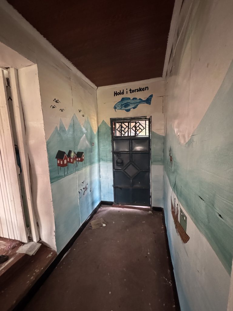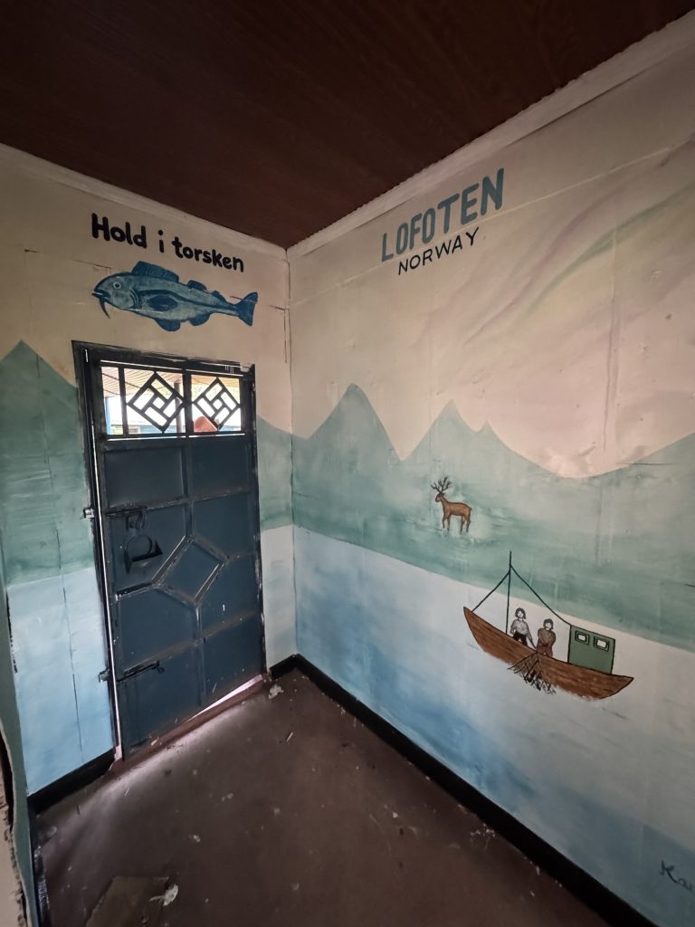 Vi har også fått male det vi kaller “den norske gangen”. Også her har vi fått full kunstnerisk frihet (og fritak fra pensum!). Det har vært ekstra gøy. I «den norske gangen» har vi nemlig hentet inspirasjon fra Nord-Norge, siden vi begge kommer derfra. Temaet ble fjell, fiskebåt og nordlys – og ja, vi har malt alt helt selv!
